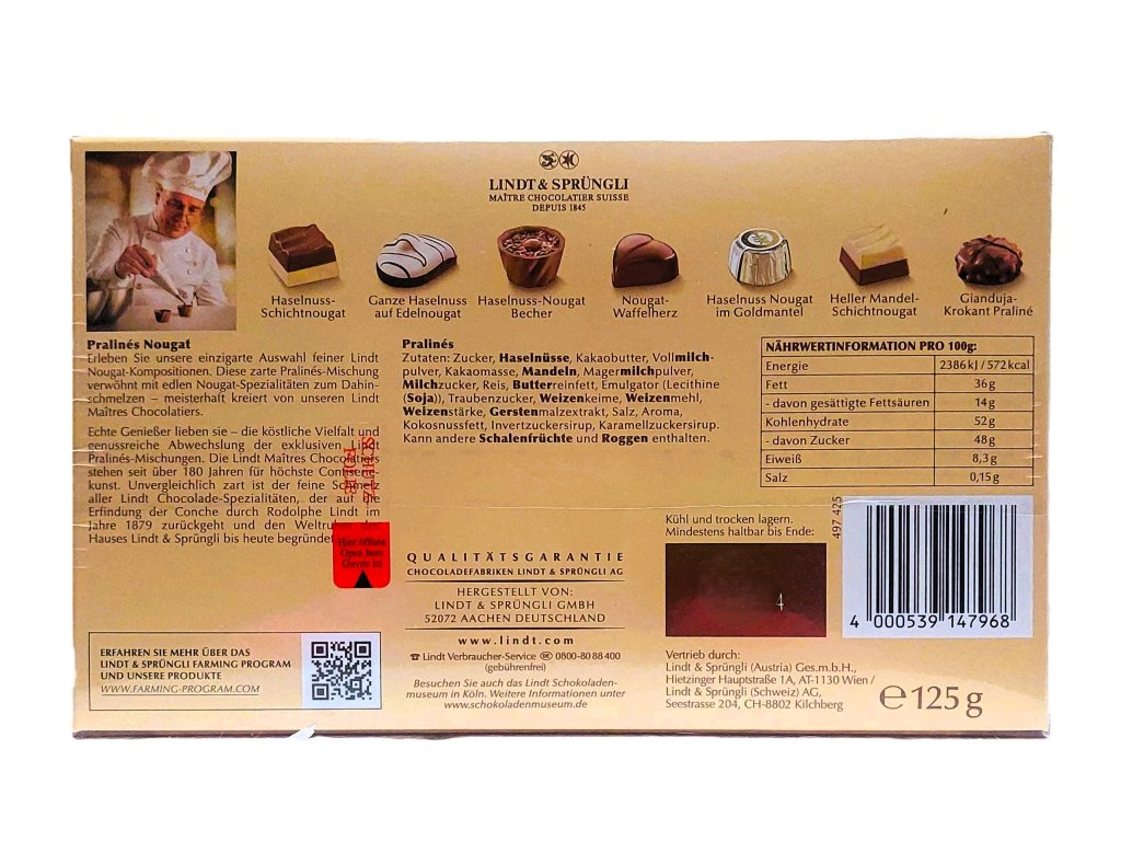 Každý, kdo vyzkouší naše nugátové pralinky, okamžitě pochopí, co to znamená mít z něčeho velkou radost. Nechte se hýčkat obzvláště jemnými kompozicemi vyrobenými z nejjemnější čokolády, v ústech rozplývajícího se lehkého mandlového nugátu, který v kombinaci s nejlepší mléčnou čokoládou Lindt vytvořili naši Maîtres Chocolatiers, aby vytvořili sofistikovaná malá umělecká díla.