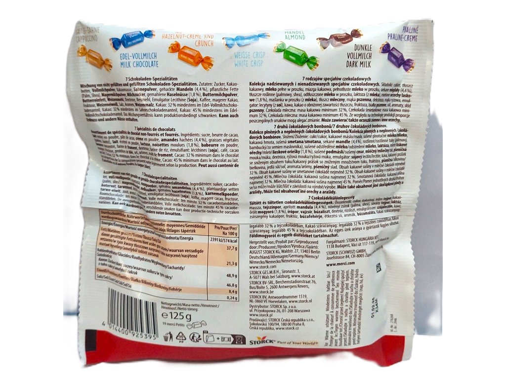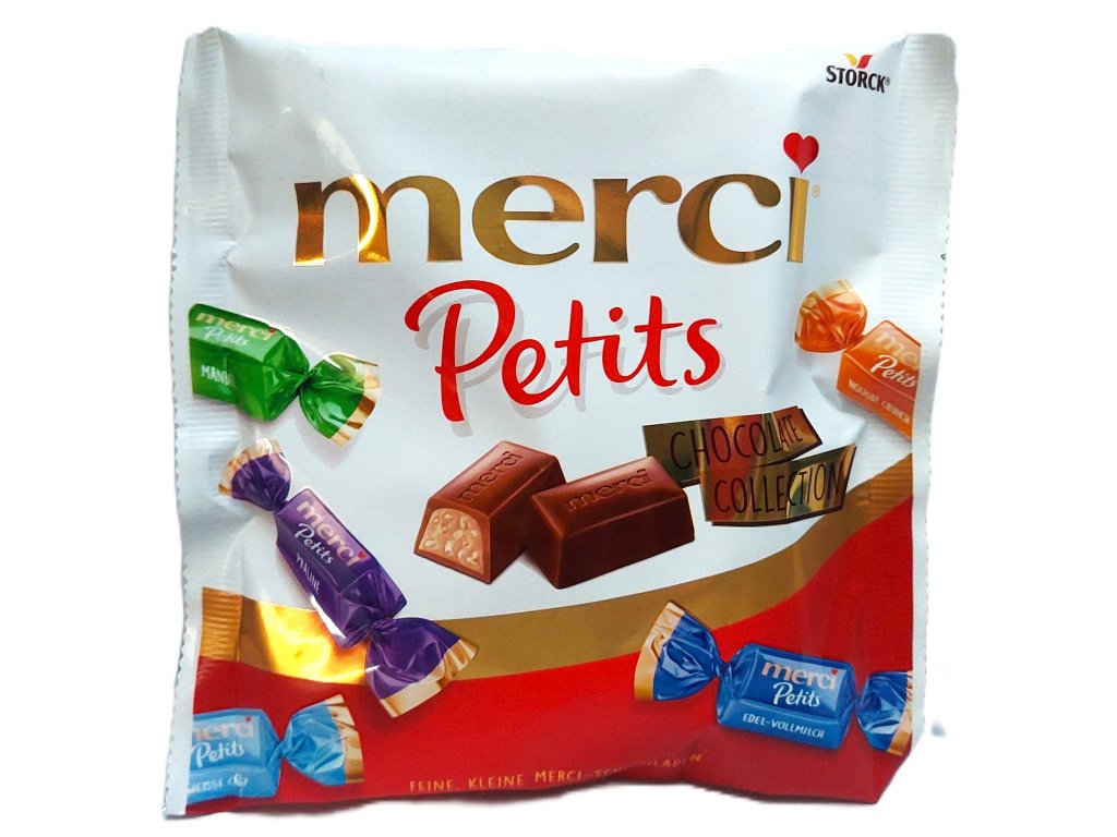 Merci Petits je 7 druhů malých jemných čokoládových pralinek. Vyrobeno z nejlepších surovin a jednotlivě balené kus po kusu.